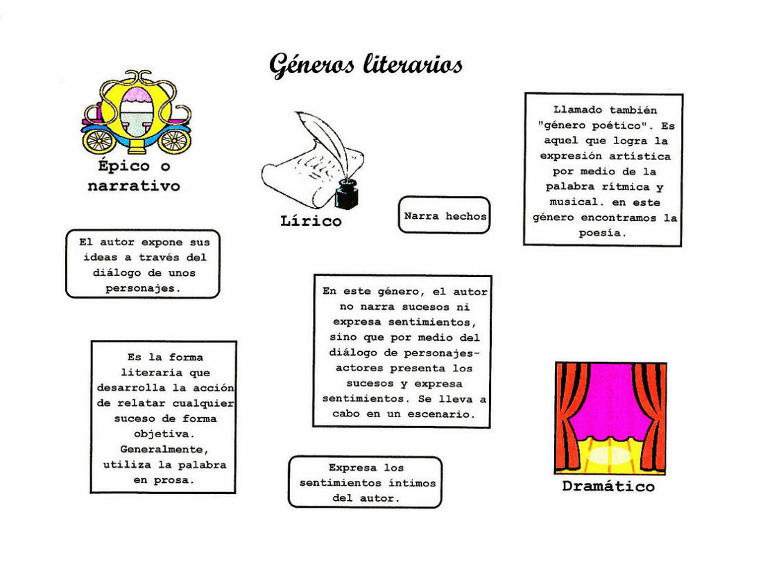 *Son géneros literarios la poesía, la novela, el cuento o relato, el teatro y el ensayo literario (incluidos los mitos).Se clasifican en: narrativo, líricos, y dramáticos.